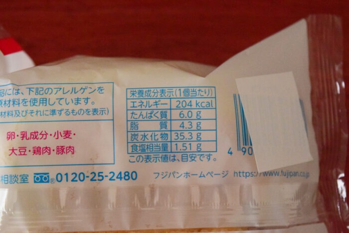 1個当たり204kcal。たんぱく質6.0g・脂質4.3g・炭水化物35.3g・食塩相当量1.51gです。