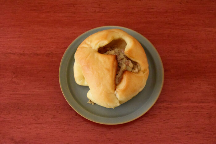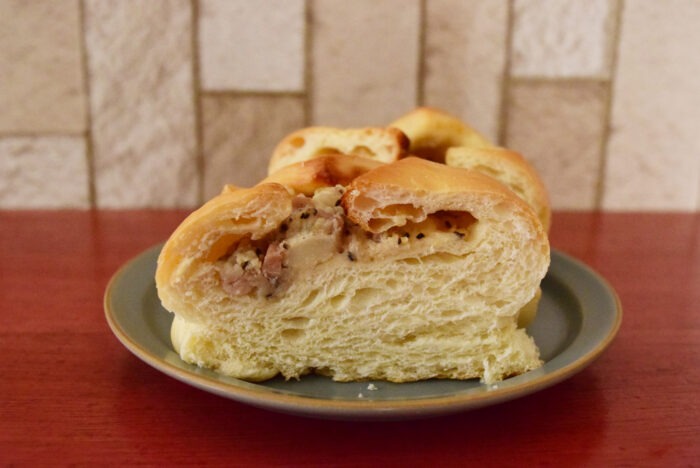 パン生地はサクッとしていて、ベーコンやポテサラはそれなりに入っています。ただ、黒胡椒が多く胡椒の味しかしません。非常に胡椒臭く、ポテサラやベーコンの味わいが吹っ飛ぶ内容でした。