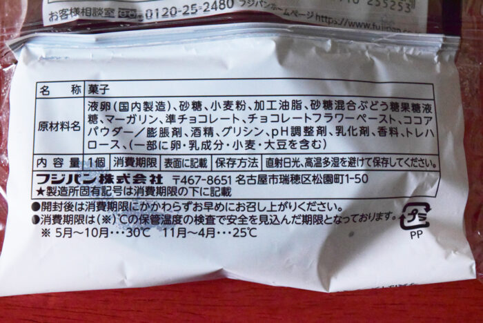 原材料には液卵・砂糖・小麦粉・加工油脂・砂糖混合ぶどう糖果糖液糖・マーガリン・準チョコレート・チョコレートフラワーペースト・ココアパウダーなどを使用しています。