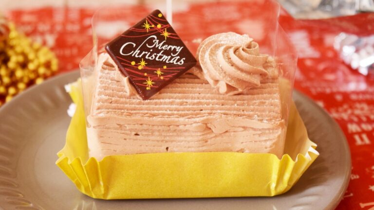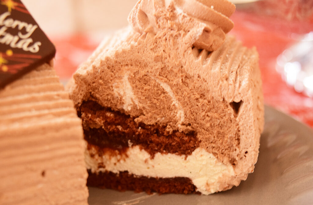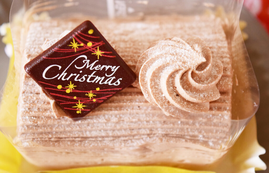 外側からチョコクリーム→チョコムース→チョコスポンジ→チョコソース→バニラビーンズムース→チョコスポンジと層を重ねていて、チョコだらけの贅沢な一品になっています。てっぺんにはメリークリスマスと書かれたチョコレートが。