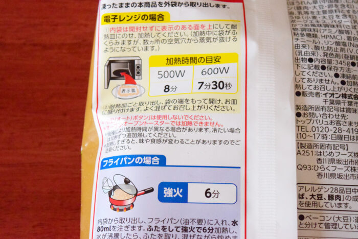 製造元ははじめフーズ株式会社。原材料はめん[スパゲッティ(デュラム小麦のセモリナ)(イタリア製造)]、野菜(ほうれん草(中国産)、にんにく)、ベーコン(豚肉・大豆・卵を含む)、豚脂、なたね油、乳等を主要原料とする食品、粉末しょうゆ(小麦・大豆を含む)、砂糖、食塩、ポークエキス、バター(乳成分を含む)、かつお風味調味料(さばを含む)を使用しています。