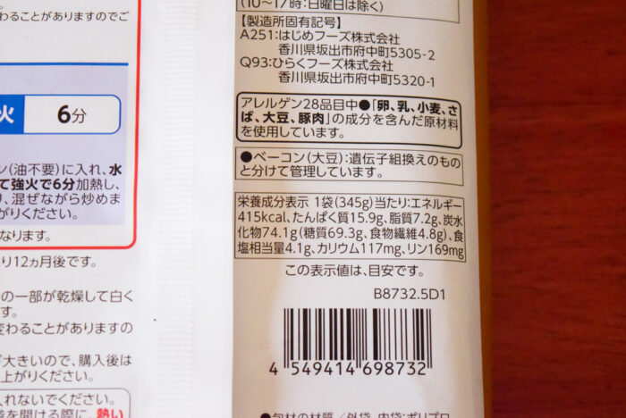 1袋(345g)当たり415kcal。たんぱく質15.9g・脂質7.2g・炭水化物74.1g・食塩相当量4.1gです。