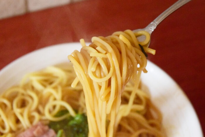 麺はプリッとしていてコシがあり、モチモチしている食感が癖になります。つるっとした喉ごしもいいです。味付けはバターのコクと味が強く、デブ食といった感じです。デブ食は美味しいので、つい食べ過ぎてしまうんですよね。具材のベーコンから出汁が出ていて、旨みに相乗効果を与えています。