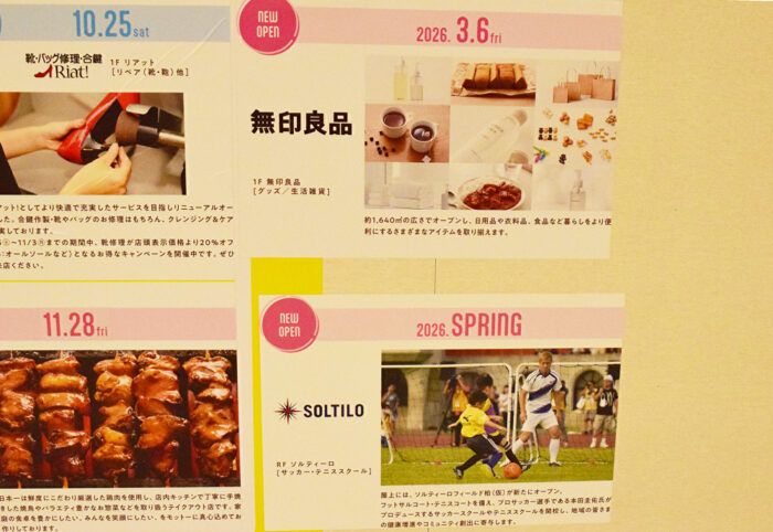 2026年3月6日には1階に無印良品がオープンします。1640㎡という広さでかなり大型店舗です。屋上にはフットサルコート&テニスコートなどを備えた施設が春にオープン予定です。