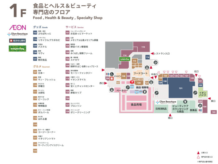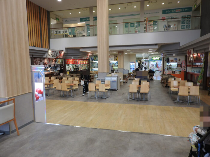 イオンノアは全部で3階に分かれています。まず、1階部分から紹介します。1階のメインはフードコートと食品売り場です。