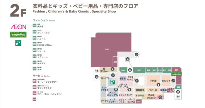 婦人服などのファッションのお店が多いのが2階です。また、ベビー用品やおもちゃなども2階に置いています。