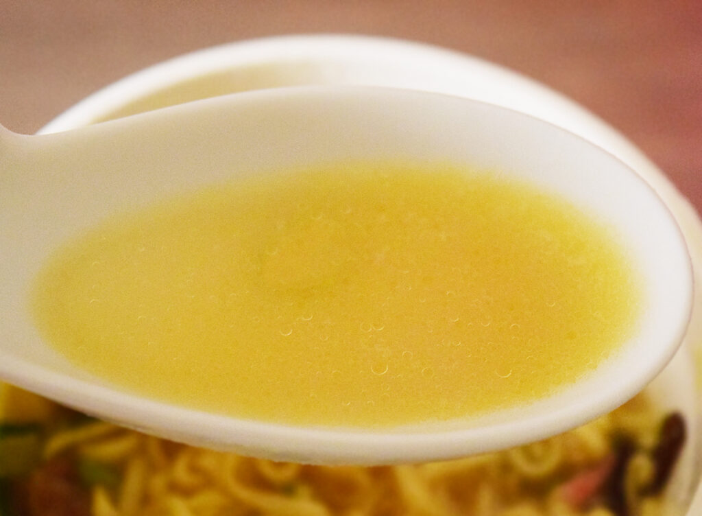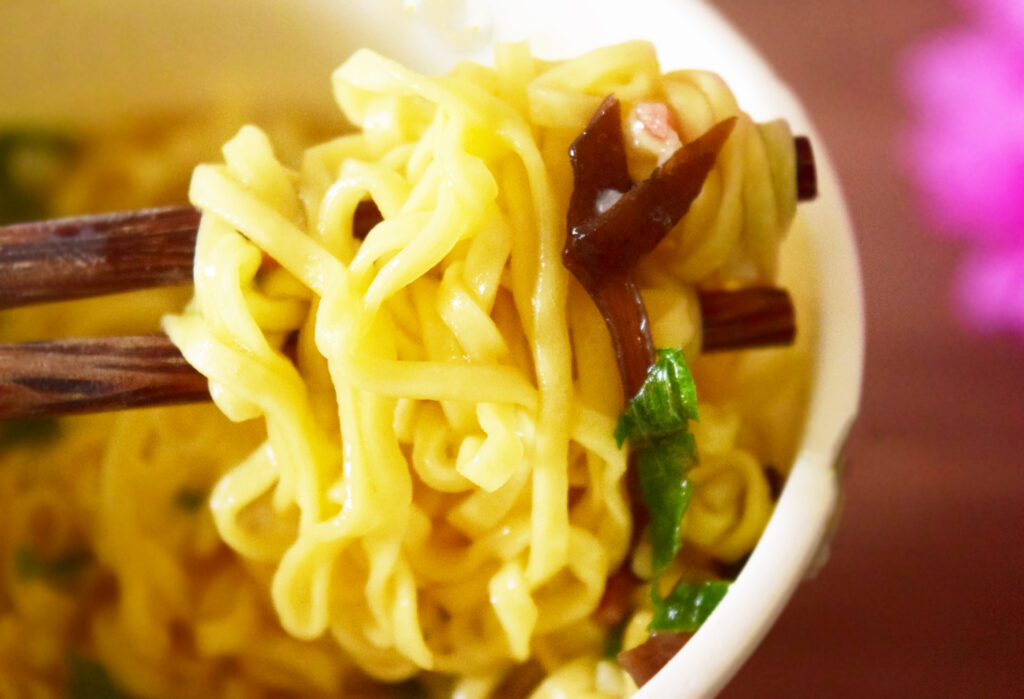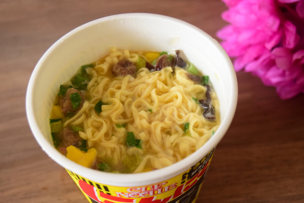 カップヌードル特有のちぢれた平打ち麺。スープをよく吸うので、わりとあっさり目のスープとよく合っていて、最後までおいしい!