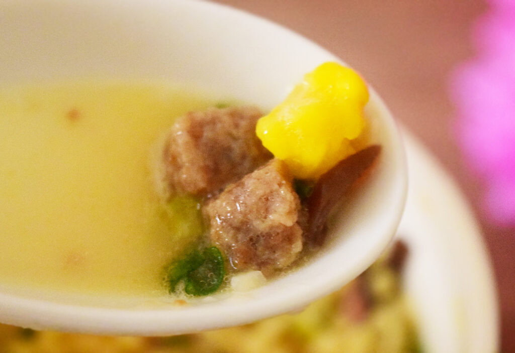 謎肉は豚骨スープと相性抜群。細かく入った紅生姜がスープの味を単調にせず、良いアクセントを利かせています。