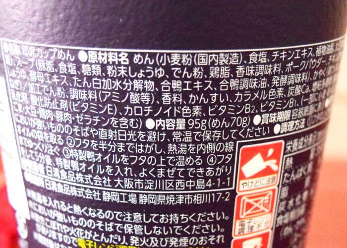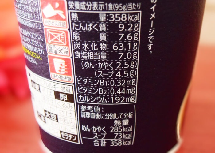1食(95g)あたり358kcal。炭水化物は63.1gで食塩相当量は(めん・かやく2.5g、スープ4.5g)でした。