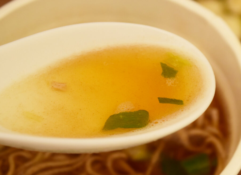 今回の「神田まつや 鶏南ばんそば」は、本節などを使ったやや濃いめのつゆに柚子を上品に効かせた味わい。具材は炭火鶏肉とネギを使っています。