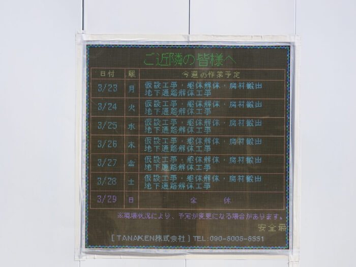 予定表を見ると平日に解体工事を行い、日曜日だけは休みのようです。筆者が撮影をしたのは火曜日だったので解体工事は行われているはずですが、非常に静かでした。