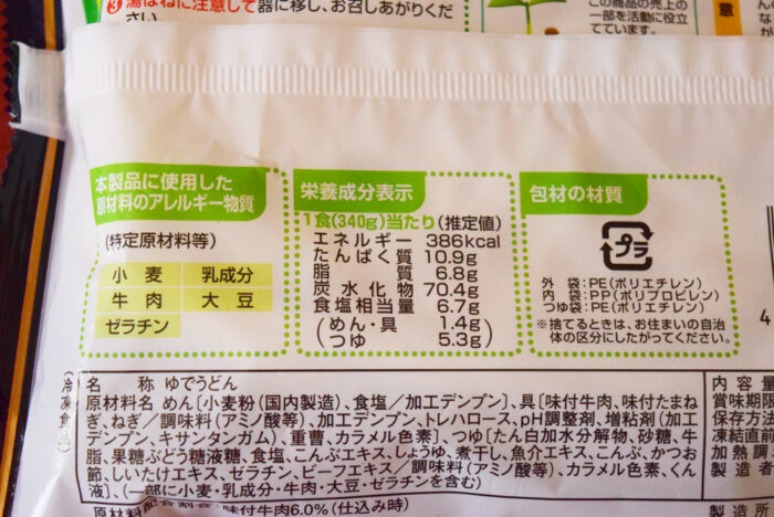 1食(340g)当たり386kcal。たんぱく質10.9g・脂質6.8g・炭水化物70.4g・食塩相当量6.7g(めん・具1.4g・つゆ5.3g)です。
