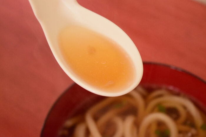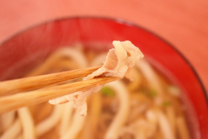 つゆは甘めでかつお節エキスと牛脂が合わさった美味しい味わい。ビーフエキスが強く、すき焼きのたれに近い部分もあります。また、具材のタマネギから染み出た出汁もいいですね。