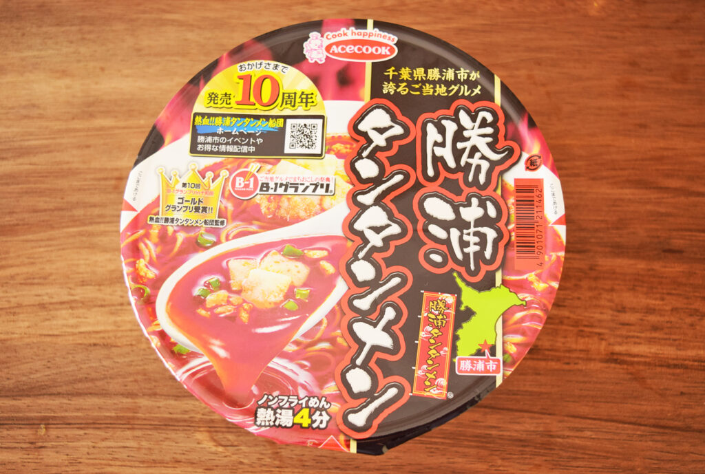 勝浦タンタンメンは千葉県の勝浦で働く、海女や漁師の体を温めるラーメンとして定着しました。通常の担々麺とことなり、醤油ベースのスープに大量のラー油と玉ねぎとひき肉を炒めたものが具材としてトッピングされています。B-1グランプリでも入賞し、勝浦地方の名物料理のひとつとして有名になりました。エースコックでは2012年よりカップラーメンとして販売しています。今回はエースコック凄麺「勝浦タンタンメン」を実食してみました。