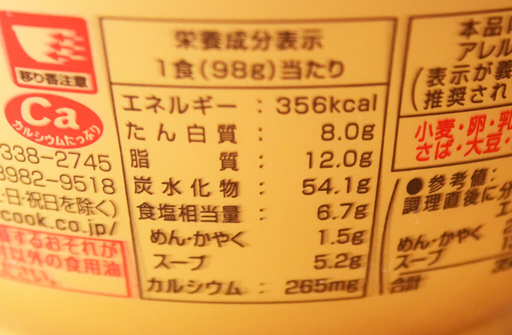 1食(98g)あたり356kcal。炭水化物は54.1gで食塩相当量は6.7gです。