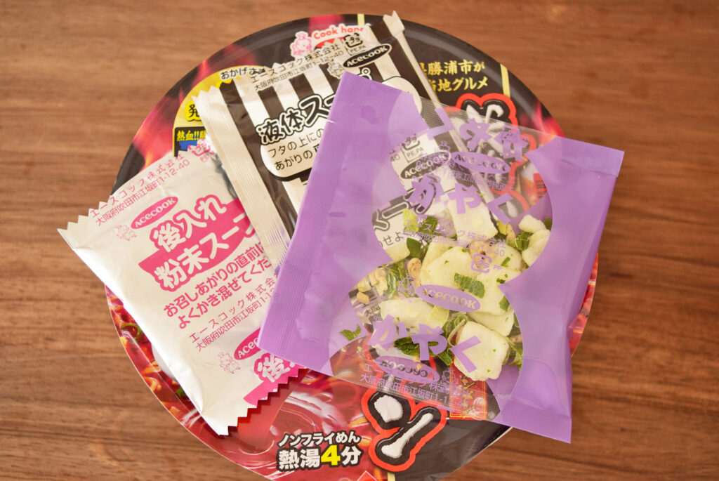 後入れの液体スープと粉末スープのほかにかやくが別途パックされていました。