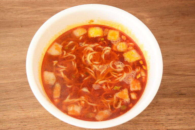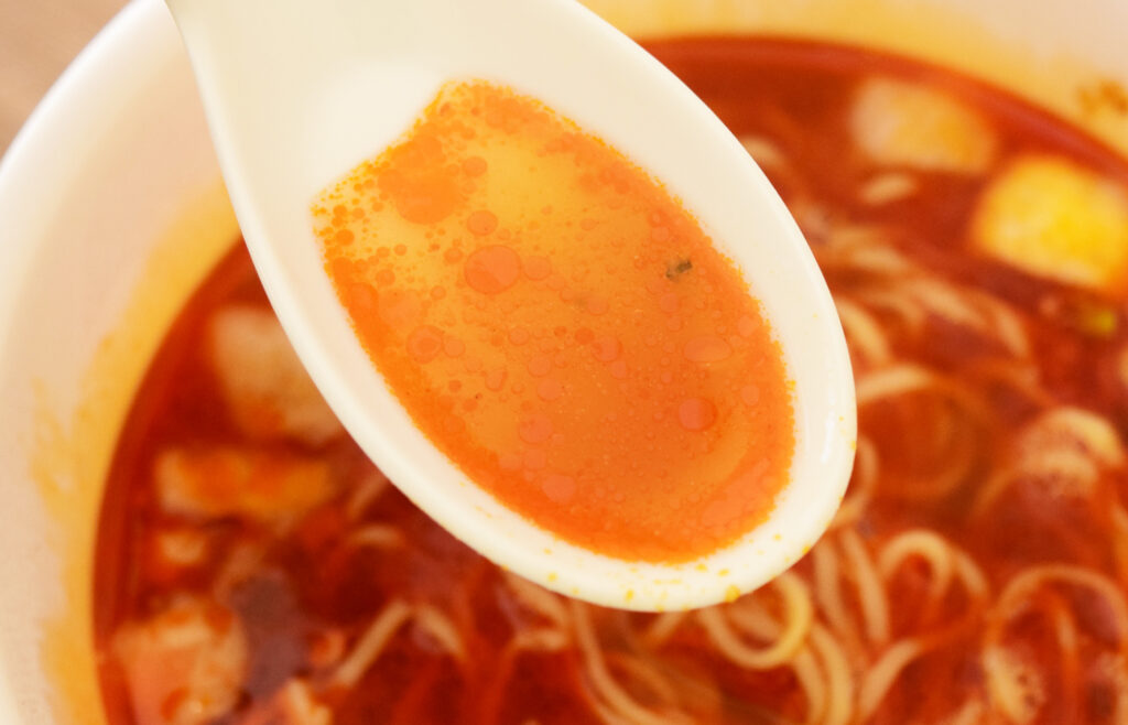 お湯をいれて4分したら完成します。ラー油と玉ねぎの香りが漂ってきます。真っ赤かなスープでとっても辛そう……
