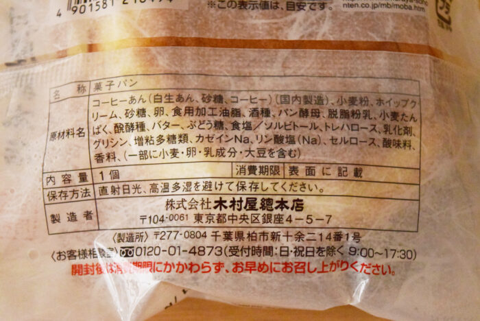 原材料にはコーヒーあん(白生あん・砂糖・コーヒー)小麦粉・ホイップクリーム・砂糖・卵・食用加工油脂・酒種・パン酵母・脱脂粉乳・小麦たんぱく・バターなど使用しています。