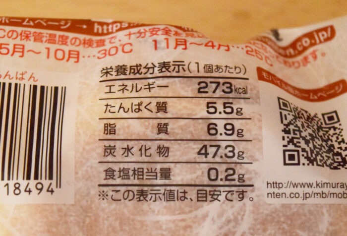 1個当たり273kcal。たんぱく質5.5g・脂質6.9g・炭水化物47.3g・食塩相当量0.2gです。