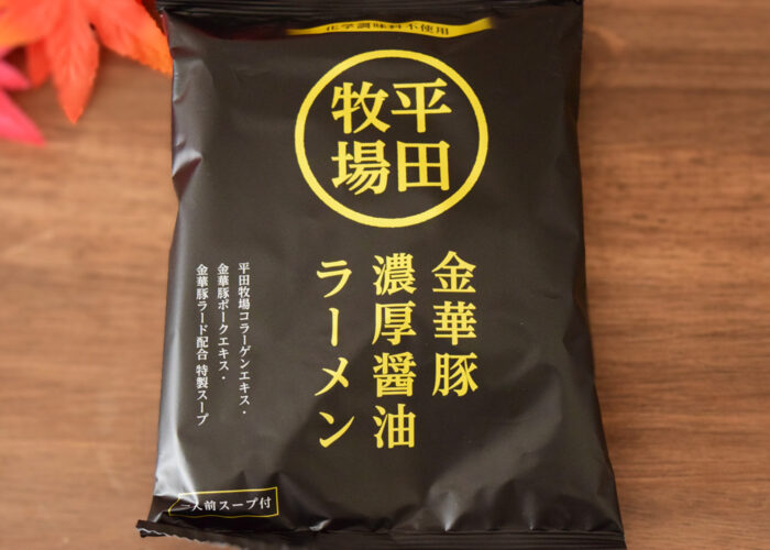 まずは「金華豚 濃厚醤油ラーメン」を見ていきましょう。黒のパッケージが特徴的なラーメン。