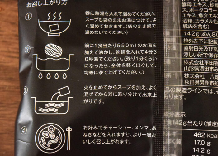 公式ホームページによると「ピリリと旨辛いスープがくせになる辛味噌ラーメンです。旨辛のスープは、稀少な平田牧場金華豚の豚骨をじっくり煮だして抽出した旨味が凝縮したオリジナルの「平田牧場金華豚ポークエキス」に、日本の米を食べて育った金華豚のあっさりとしながらもコクのあるオリジナルの「平田牧場金華豚ラード」を白味噌で整え、アクセントに唐辛子を加えた濃厚で味わい深い特製スープです。またスープには、豚骨を煮だして抽出したコラーゲンが入っていることも大きな特徴です。コラーゲンは美容や健康にも寄与しますが、スープをまろやかにする調味料としてもおいしさに大きく貢献しています。もちろん調味料(アミノ酸等)は不使用です。麺は低温でじっくりと乾燥した、生麺本来の味わいが感じられる『低温ミスト熟成乾麺』です。」とのことでした。こちらも調理方法は同じです。