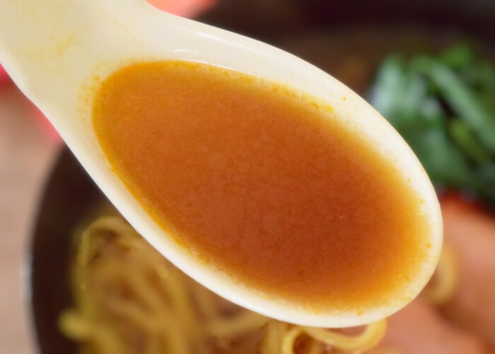 まずはスープから飲んでみましょう。ピリッと辛いスープですが濃厚な金華豚の出汁を感じられ、辛さの中にもまろやかさも感じられます。スープの中に入っているニンニクの香りが濃厚な味噌スープと合わさり、辛さと相まって程よいアクセントになっているのが印象的です。濃厚でありながらアクセントが効いているためか、後味はすっきりしていて飲みやすいスープでもあります。ラーメン屋さんもたじたじな出来栄えです。