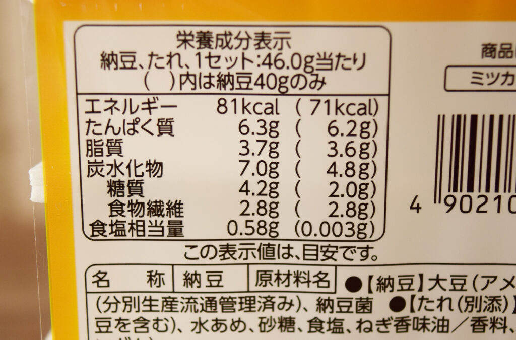 1パック(40g)あたり81kcal。食塩相当量は0.58gです。たれを入れない場合は食塩相当量は0.003gと非常に少なくなるものの、たれなしだと強みが全く生かされない納豆になってしまいますね。