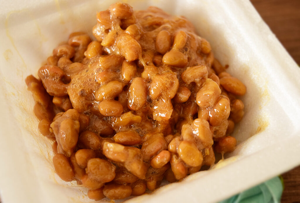 実食してみると、思ったよりもすき焼きの味わいはマイルド。たれだけ味見してみると、結構すき焼き特有の味はしていますが、なにしろ納豆の存在感が凄まじい……。けれど、よく食べる納豆とはひと味違って良いですね。