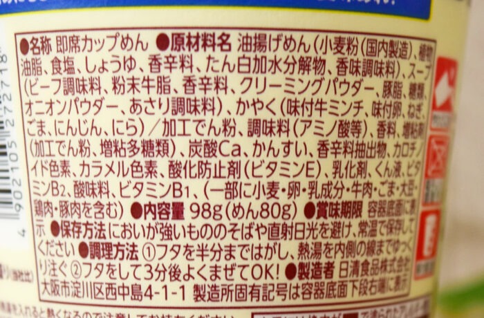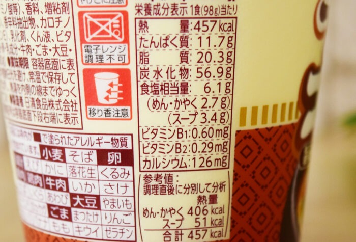 1食(98g)あたり457kcal。食塩相当量は6.1g(めん・かやく2.7g、スープ3.4g)です。
