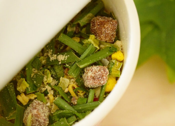 具材は謎肉・たまご・ねぎ・ニラ・ごま・にんじん。調理時間は3分です。
