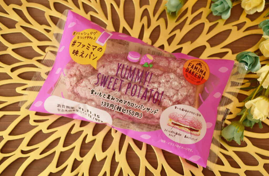 SNS映えするような映えるパンとして登場した、ファミリーマート「紫いもと黒みつのマカロンパンサンド」。菓子パンですが、ほぼスイーツですね。