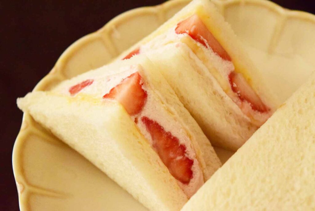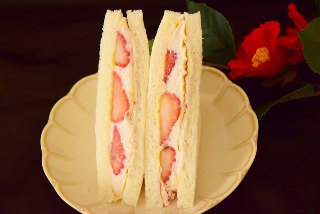 サンドイッチを半分にカットしてみると、奥にはさらに半割苺が1個ありました。クリームは甘さ控えめで、苺の味をほのかに感じる程度。苺が多く、苺がメインのサンドイッチとわかります。