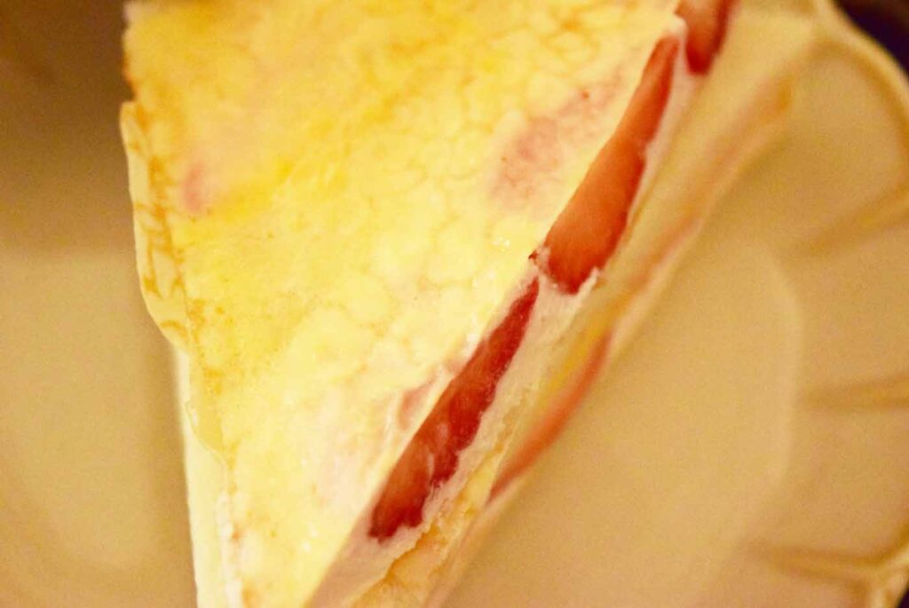 クリームをどかしてみると、パンとの間にミルクレープが2枚挟まっていました。クリームは苺が混ざっているためか、少しピンク色です。