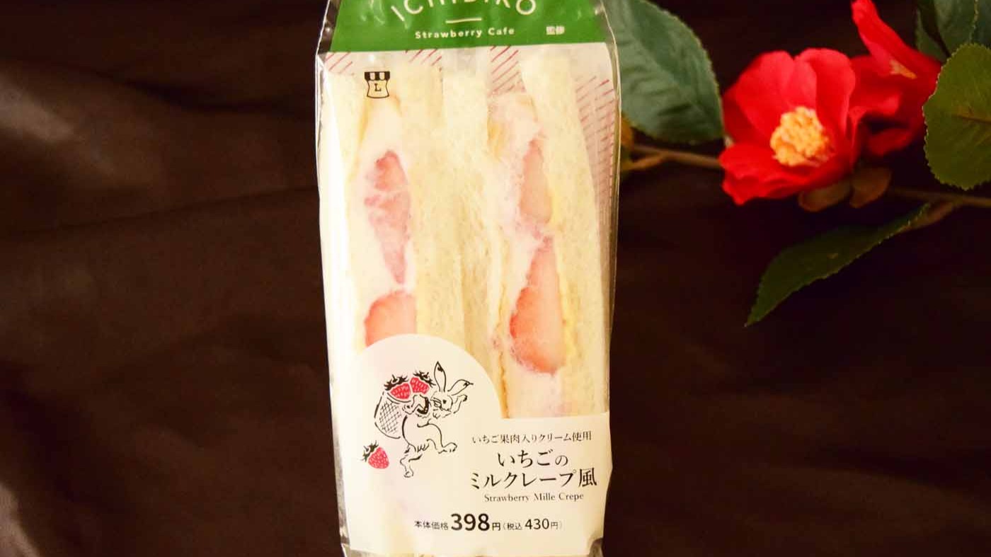 今回はローソンの「いちご狩り!!」ラインナップの1つ「ICHIBIKO監修 いちごのミルクレープ風サンド」430円(税込)を実食(2023年時)。ICHIBIKO監修品は2025年まで出ていたのですが……2026年「ローソンでいちご狩り」では出なそうですね。