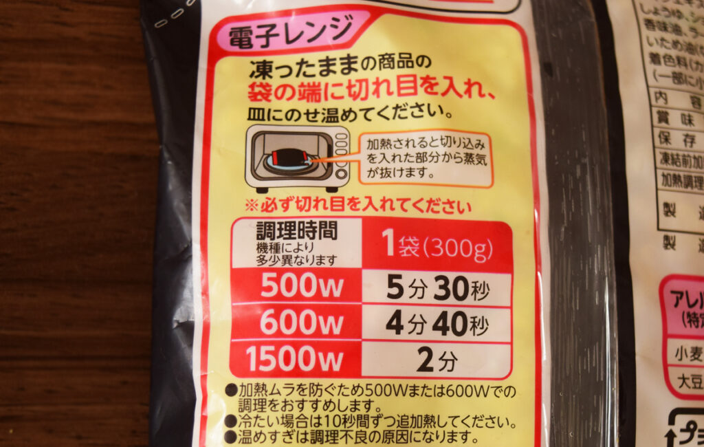 1袋の内容量は300g。冷凍炒飯としては小ぶりな気がしますが、コンビニで販売している冷凍炒飯としてはよく見かけるサイズ感。1人前を想定しているのでしょう。