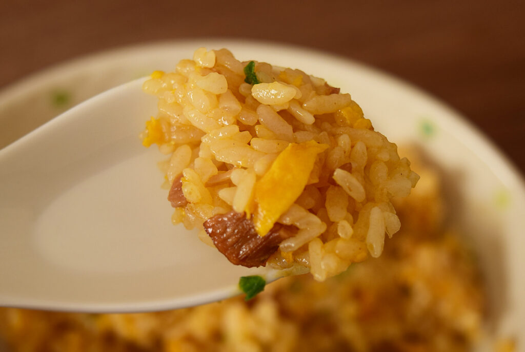 できあがりはこちら。油っぽくて香ばしいにおいが漂います。一口食べてみると、かなり脂っこいんですが、ガツンとした塩味のきいたチャーハンが食欲を掻き立てます。ごはんは、べちょっとしていますね。この辺は好き嫌いがわかれるところでしょう。