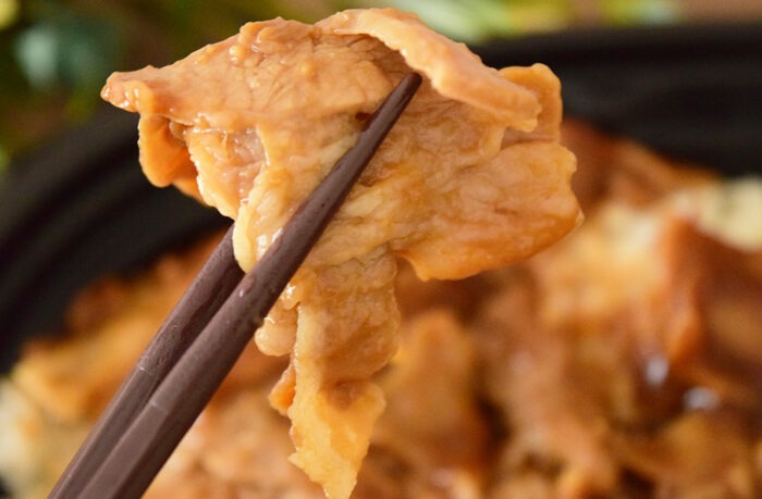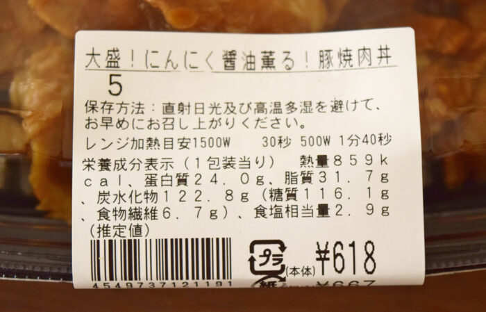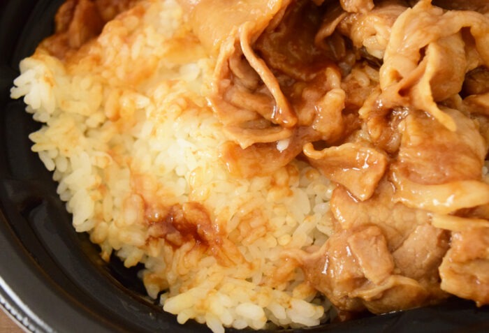 温め終わった「大盛!にんにく醤油薫る!豚焼肉丼」がこちら。食欲誘うニンニクの香りが鼻をつつきます。