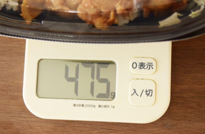 重さを計ってみると475g(容器の重さ含む)。普通のコンビニ弁当よりは重め。
