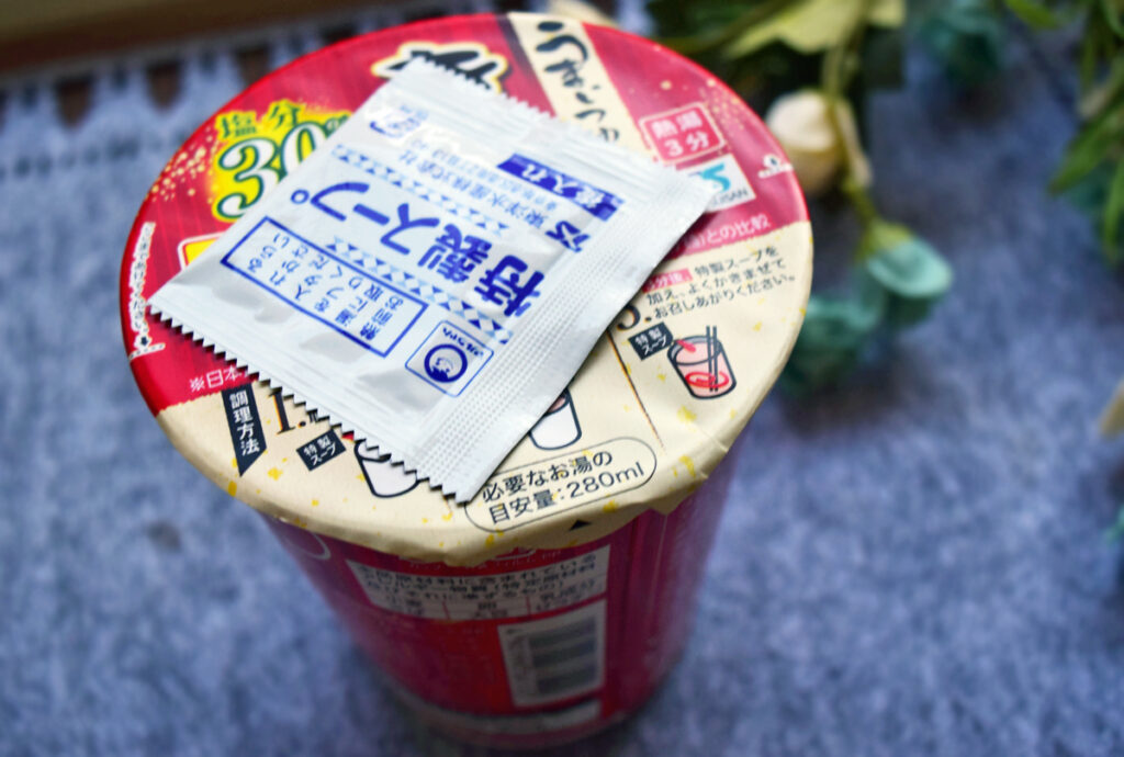 今回紹介する「うまいつゆ 塩分オフ きつねうどん」は、和風スタイル即席カップめんと比較して食塩相当量を30%オフした減塩したい人におすすめしたい一品。2016年に発売、そして2021年2月8日にリニューアルしました。後入れ特製後入れスープはカップうどんの旨味を増す秘密兵器といったところでしょうか。