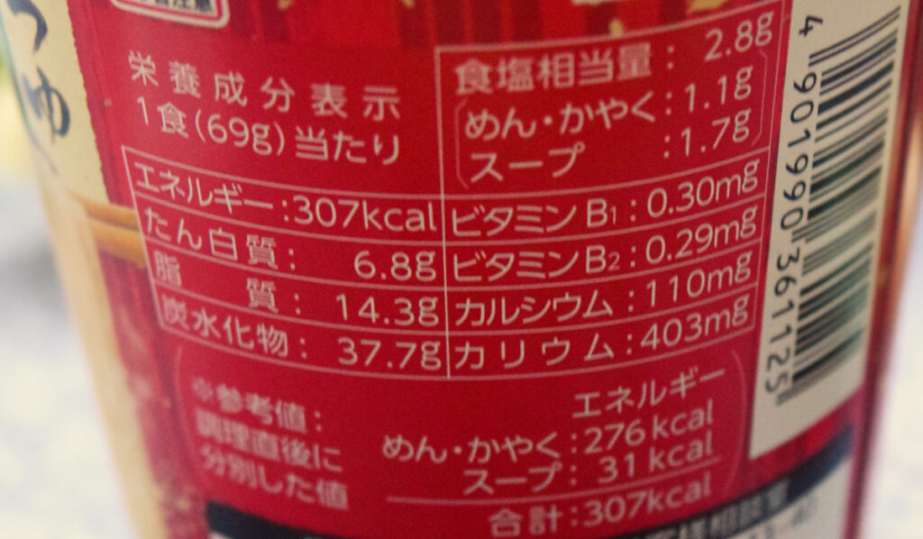 1食(69g)あたり307kcal。食塩相当量は麺・かやくが1.1g・スープは1.7gで合計2.8g。スープを飲まなければ1.1gの塩分でおさまります。