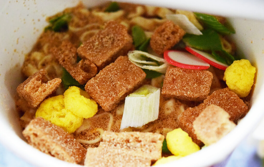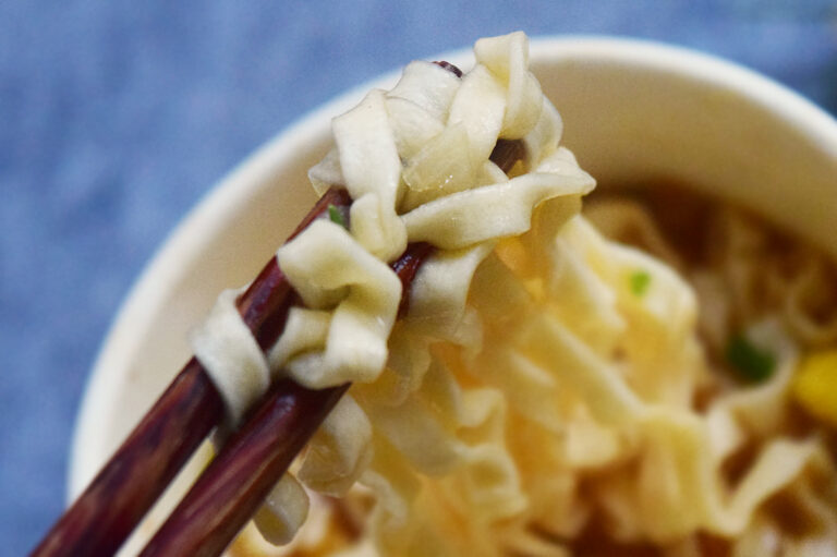 麺はわりとちぢれ気味。ちぢれ具合と麺の食感は赤いきつねとほとんど変わりません。減塩と言われなければわからないクオリティでした。