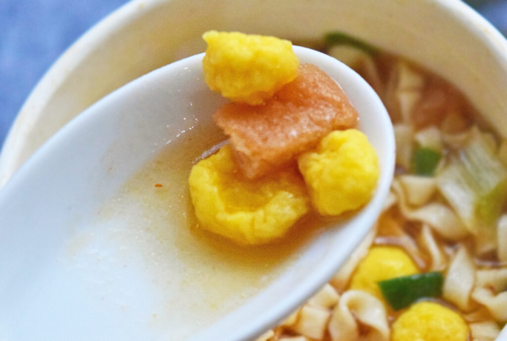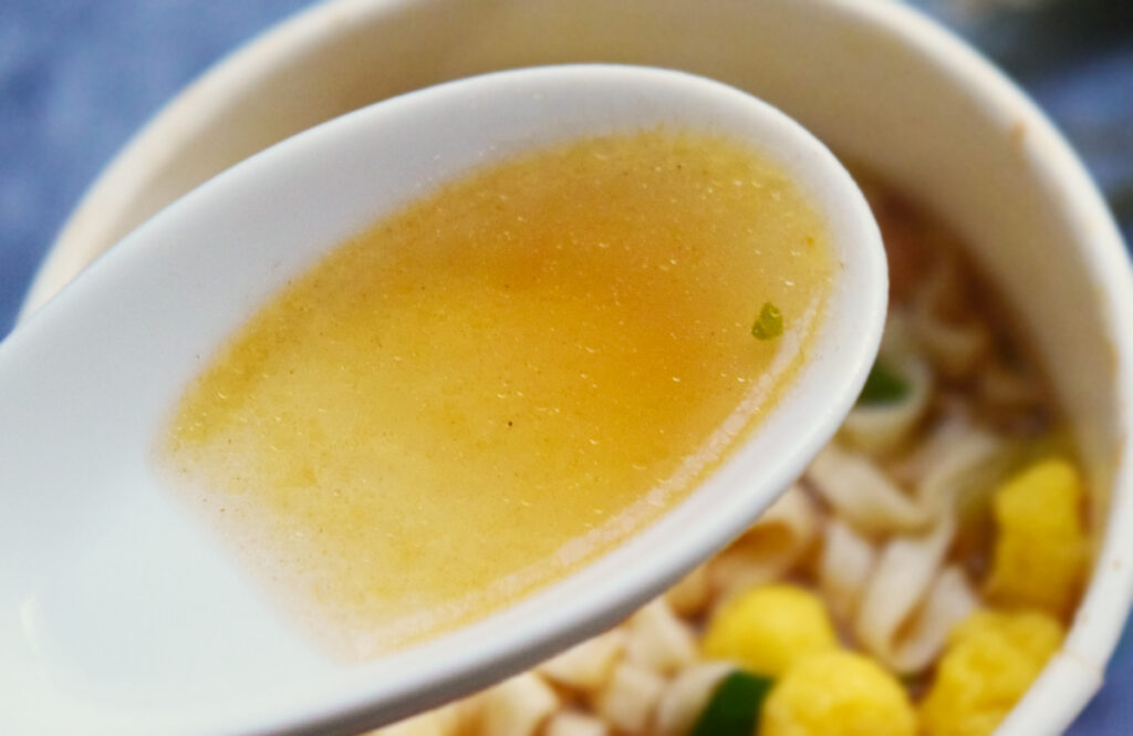 出汁の効いたスープは「本当に減塩?」と思ってしまうほど出汁がきいています。普通のカップうどんよりは若干薄めではあるものの、減塩色とは思えない程のクオリティ。