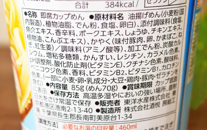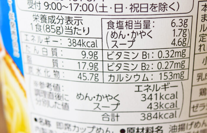 1食(85g)当たり384kcal。食塩相当量は6.3g(めん・かやく1.7g、スープ4.6g)でした。