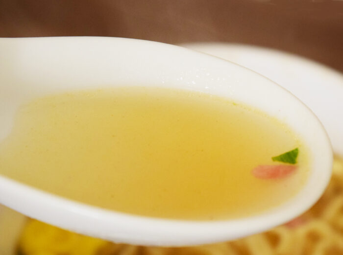 スープは紅しょうがの味が強く、塩系のさっぱり味。魚介やポークの出汁を期待しましたが、さほど感じられません。スープ出汁がおとなしいがゆえに、紅しょうがの味が強調されていると思います。塩分は6.3gと高いものの、さほど濃く感じられない味なのは出汁が弱いからかもしれません。