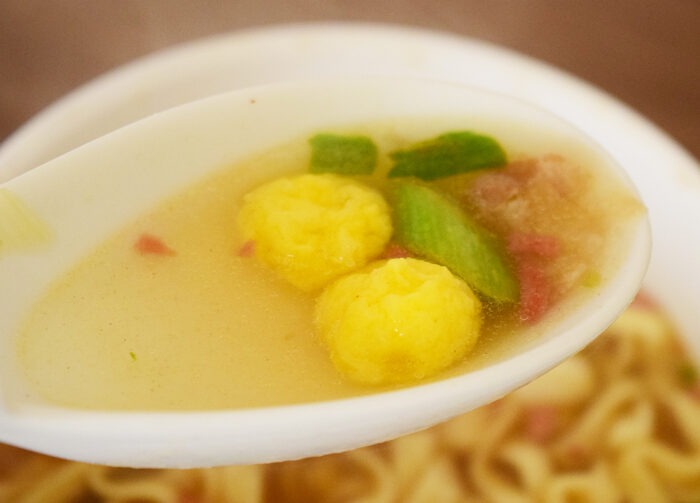 かつおとソーキがメインのスープ。ちなみに、ソーキとはスペアリブのこと。沖縄そばとソーキそばの違いは、沖縄そばは3枚豚バラ肉がトッピングされたもので、ソーキそばはスペアリブがトッピングされたものをいいます。