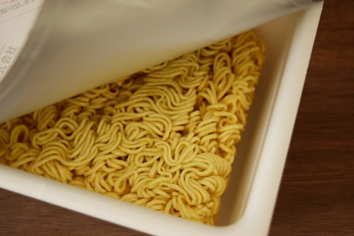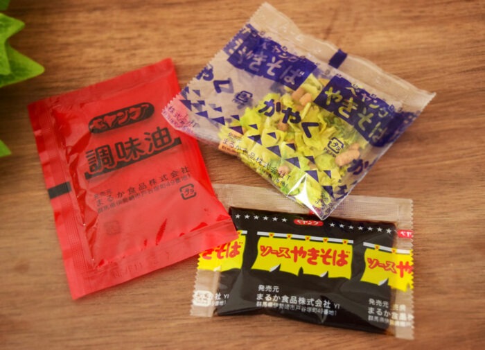 麺の他にキャベツと味付け鶏ミンチのかやくと後入れ調味料が2種類はいっています。1種類は油のみです。
