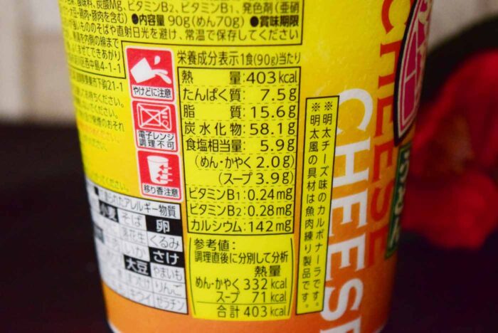 1食(90g)当たり403kcal。食塩相当量は5.9g(めん・かやく2.0g、スープ3.9g)。明太風の具材は魚肉練り物だそうです。ということは明太子ではないということですかね。