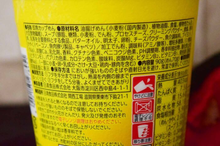 スープの原材料にはプロセスチーズ、クリーミングパウダー、明太子、チーズパウダーときゃちフレーズ通りの調味料が入っています。かやくを見るとベーコン、魚肉練り物、キャベツとカルボナーラと明太子を意識しています。