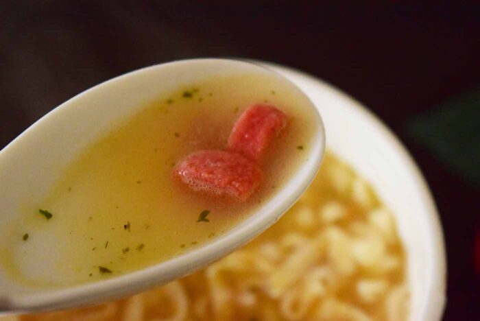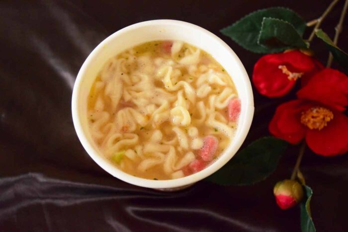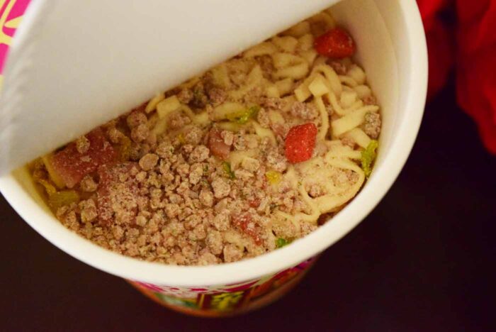 麺の湯戻し時間は5分。かやくの見た目が赤い「魚肉練り物」も麺と一緒に入っていました。
