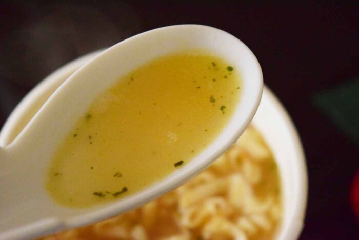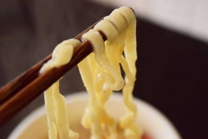 どん兵衛独特のもちっとしていながら適度にウェーブがあわさった麺はカルボナーラスープとあっています。ちぢれ具合の絶妙でスープをうまくからめとっているのがいいですね。コシもあり食べ応え十分でした。
